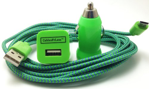 CablesFrLess (TM) 3 in 1 10ft (10 feet 10') Braided High Quality Durable Micro B USB Charging Kit fits Android Samsung Galaxy HTC LG Pantech Blackberry Motorola Sony ZTE (Green Purple)
